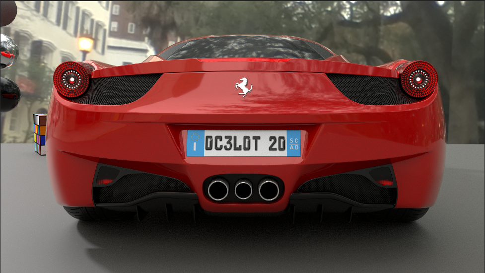 These helped me stay grounded to how specular the car paint should be, and also how transmissive the windows/clear glass should be. Using this information and looking at reference again I have come to this solution for our car's look. Like I mentioned in my liast update, I still have a slightly yellow tint on the specular parameter of the car so that it would reflect a more yellow tint than white. I also added some light metalness in the shader parameters as well. I believe that it helped make the car look more mechanical than "toy like". Here are a few test renders of our Ferrari thus far.